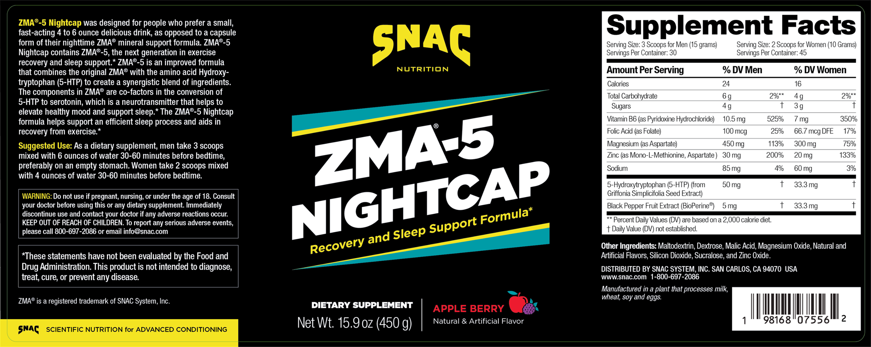 Suggested Use: Experience the ultimate blend of sleep support, recovery, and sustained energy by pairing ZMA®-5 Nightcap with SNAC’s ProGlycosyn and Multi-Vitamins. Start with ProGlycosyn before bedtime to release energy steadily throughout the night, fueling your body’s muscle repair processes while you rest. Add ZMA Nightcap to enhance sleep quality, reduce muscle soreness, and ensure you wake up feeling rejuvenated.